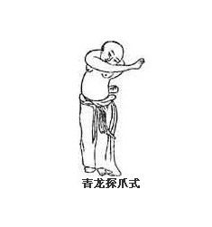 诀曰:青龙探爪,左从右出;修士效之,掌气平实;力周肩背,围收过膝;两目平注,息调心谧。