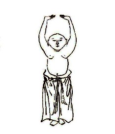 两腿开立,双手仰掌由胸前徐徐上举至头顶,目视掌而移,身立正直,勿挺胸凸腹;十指交叉,旋腕反掌上托,掌以向上,仰身,腰向后弯,目上视;然后上体前屈,双臂下垂,推掌至地,昂首瞪目。呼气时,屈体下弯,脚跟稍微离地;吸气时,上身立起,脚跟着地;如此反复21次。收功:直立,两臂左右侧举,屈伸7次。
